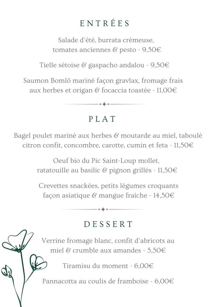 Des repas maison copieux et savoureux, composés d’ingrédient frais pour un vrai goût d’authenticité. A vous de composer votre menu en un, deux ou trois actes, pour savourer chaque étape selon vos envies.